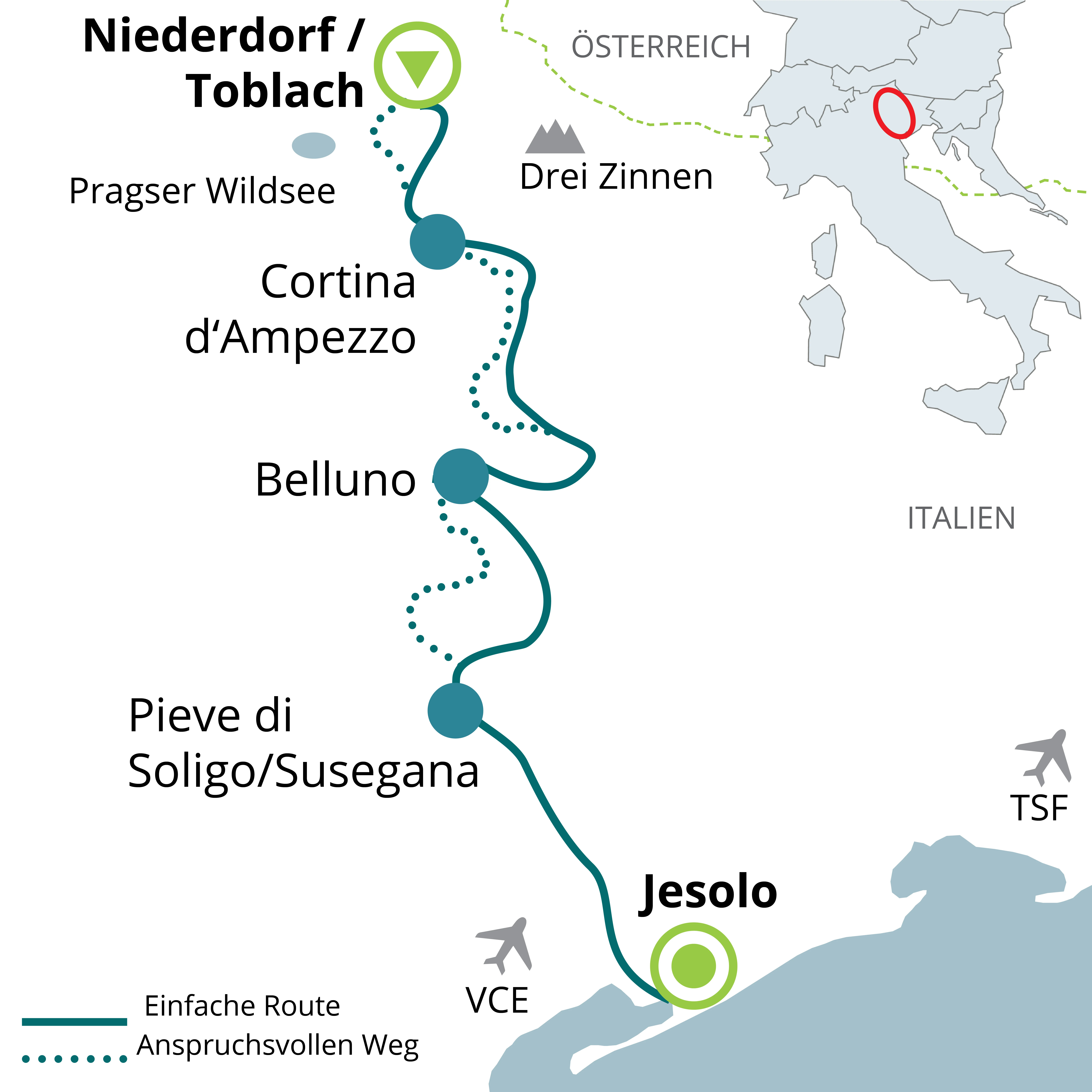 A kimondottan gravelesek számára összeállított túra Toblach/Dobbiacioból indul, változatos domborzati viszonyok között érinti Cortine d'Ampezzo-t a téli olimpiai várost, áthalad egy régi vasútvonalon is és a kedvelt Jesolo tengerparti üdülőhelyen ér véget.