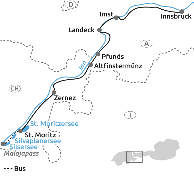 A svájci Alpokban eredő Inn-folyó mentén kiépített és kijelölt kerékpárúton változatosan lehet kerekezni Ausztrián keresztül egészen a németországi Passauig. Ez a kerékpártúra változat az útvonal első szakaszát járja be St. Moritz és Innsbruck között, hegyóriások lábánál és zömében mégis sík terepen.