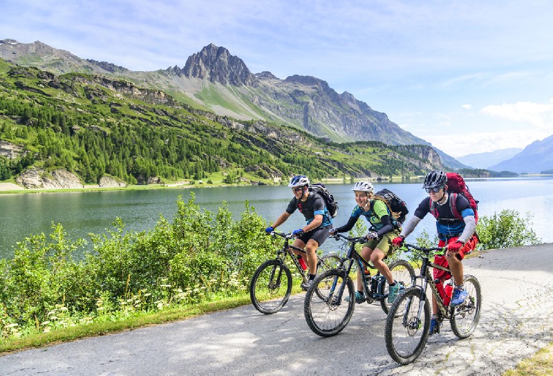 3.nap vasárnap: Kerékpártúra St. Moritz-Zernez, kb. 60km. (A Maloja hágóra busz viszi fel a túrázókat.)