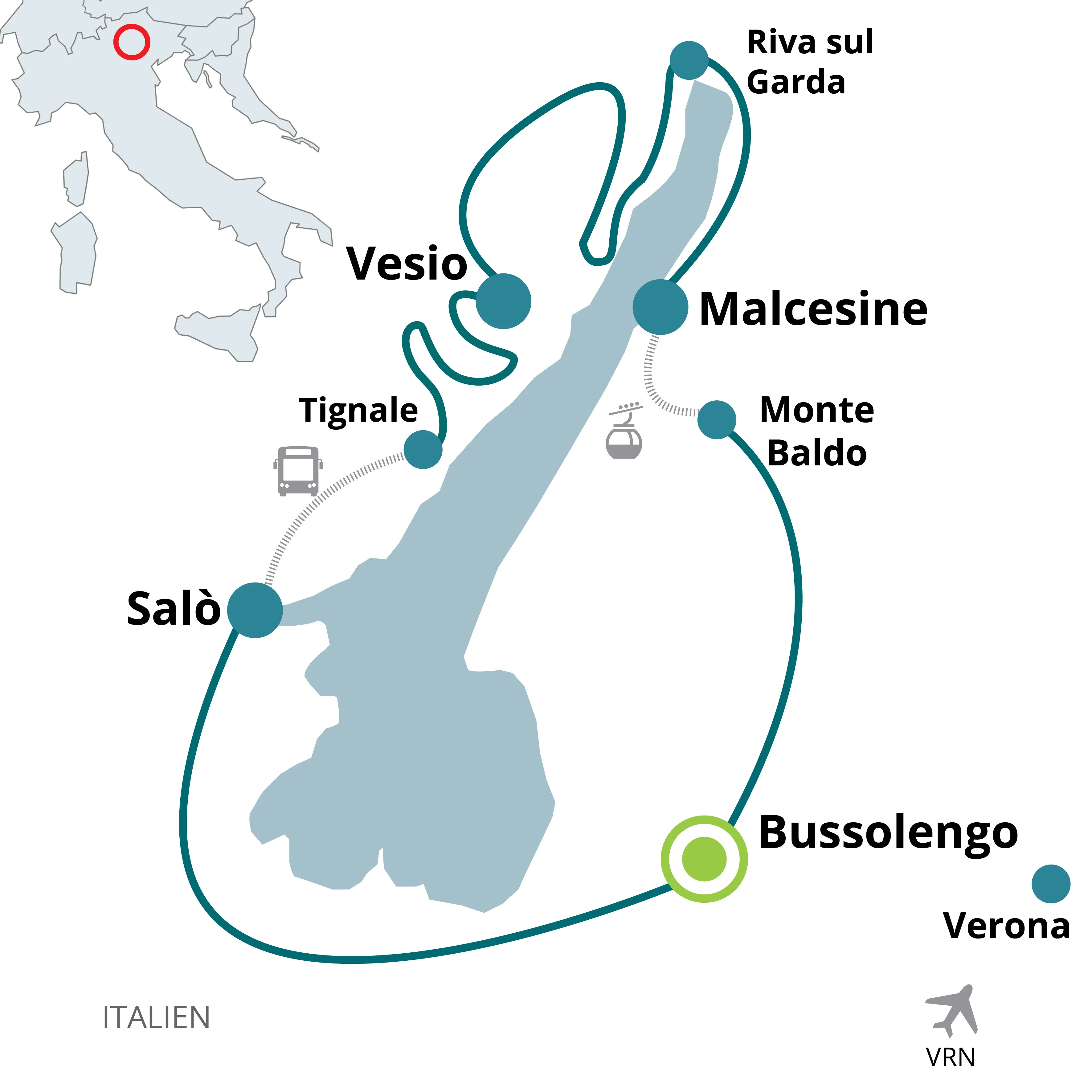 Távolság a túra kiindulópontjáig: Budapest - Garda tó (Bussolengo) kb. 820km